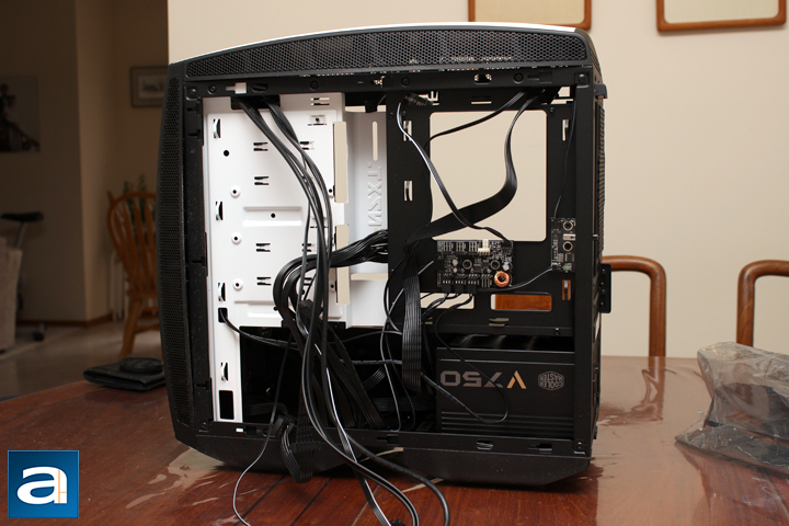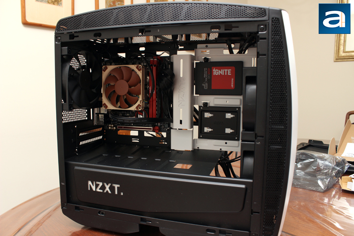 As with every installation I do, the first thing I take is the power supply and slot it into place. In this case, it is the Cooler Master V750 750W. Just to note, NZXT states a maximum length of 363mm for the power supply clearance, but I doubt anyone has such a long computer power supply for anything other than a server. In fact, if you do have one, feel free to post it in the forums, and I will personally congratulate you. In addition, while there is such clearance, you probably want it to be a bit shorter to allow for cables to route to the motherboard and other components. I slid it into the Manta, took the needed cables, and wired them from the power supply into the predicted areas in my case. As this is the first ITX build I have done, not everything was placed where I predicted, so I ended up having to do a few extra rewiring later on. I also routed all the case cables, including the USB 3.0 header, the front panel pins, and the fan hub connectors. As some mITX have different layouts for their connectors, the suitability of the Manta's routing holes may vary. Personally, I think NZXT has provided an adequate number of holes for all sorts of mITX layouts. Next, I installed the Patriot Ignite 480GB into one of the front sleds, and mounted it into place. Thankfully, with the way it was placed, the wording on the SSD was upright. However, some drives will be oriented upside down, which may probably bother some.
