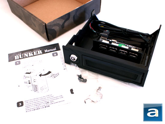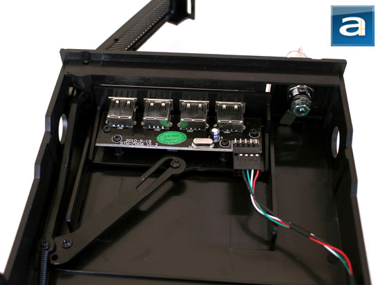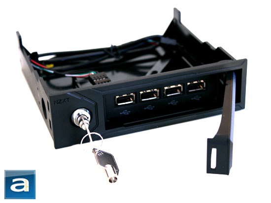 At closer inspection of the NZXT Bunker, we can see it is almost entirely made out of hard plastic. As you can see from the photo above and from the features list, the Bunker houses four USB 2.0 ports, obviously used for any of your USB 2.0 devices. However, once you have your devices plugged in, the devices stick out quite a bit. Fortunately, NZXT has decided to implement a spring loaded design so the connector retracts into the bay and permit the door to be closed and locked. I will be touching on this feature in more detail in just a moment.