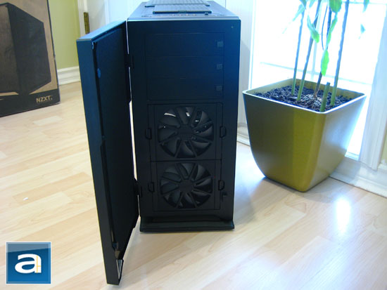 Opening the front panel reveals the expandability options of this case. Like the Fractal Design Define R3 and Define XL, the door opens only in one direction, so if you need it to swing the other way, then you are out of luck. Going along with the clean theme, there is not much here to wow the owner, but there is more than enough to satisfy users who like simple, modern looking designs. Three external 5.25" drives bays can be found here, with buttons on the right side to help remove the temporary plastic panel used to fill up the slots. We will discuss more about these as well as installation of drives on the following pages. Below these three drive bays are two 120mm fans; both of which are open to be seen, along with a mesh-like fan filter to prevent too much dust from entering the interior. Quietness is a big item for the NZXT H2, and as such foam padding on the inside of the front panel adds to its noise dampening capabilities.