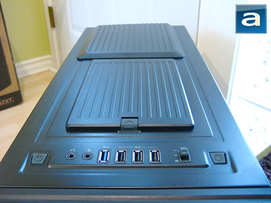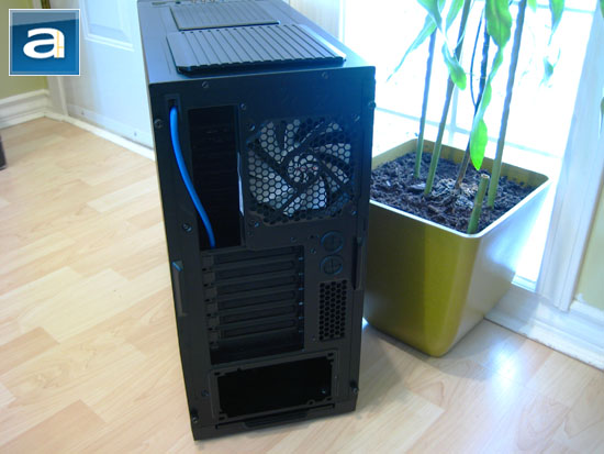 Oscillating the case around (I'd like to see you do that at 500Hz. - Editor), we are treated with a look at the back of the case, and all of the goodies along with it. The first thing that sticks out -- literally -- is of course the blue cable; directed from the top of the case. This blue cable is used for the front USB 3.0 ports, and goes to the back of your motherboard. Although this may seem like a hassle, this is done so computers that do not have internal USB 3.0 headers can still use the USB 3.0 port up front, as well as enabling the three USB 2.0 ports. The top of the case features a storage bay for one hot-swappable SATA solid state drive and hard disk.