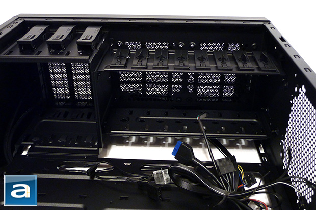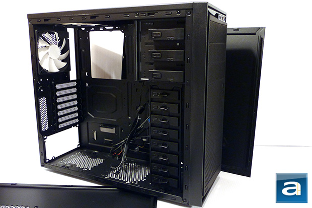 Alright, hold up, who here has eight 3.5" drives? Yes, the NZXT Source 220 features a vast array of 3.5" bays. I'm actually very impressed with the two fan positions located directly in front of the 3.5" drive bays. They not only are easy to access, but are also are designed to cool four of the eight 3.5" bays. The fan wires can also be easily directed to the back of the motherboard tray, since the front area is fully accessible from both sides. For a tool-free installation, I have to say installing hard drives is very easy. Just twist the knob and pull. It can't get much simpler than that. Well, actually it can, because you can reinstall the hard drive clamps upside-down without any issues. I'm not sure if they intended for it to work that way, but I guess it is one of those 'hidden' features. The 5.25" drive bays are located just above the 3.5" drive bays, and they also offer a tool-free mechanism. The clamps on the 5.25" drive bays were improved over the Source 210 Elite version, and are much easier to open. It seems to me they made a minor improvement, and this has really made the installation much easier. At first glance, you might not realize they use hinges, but you will find out pretty quickly once you try to lift them up. The front panel covers for the 5.25" bays come off from the inside with any trouble, and can be pushed back into place with just as little effort.