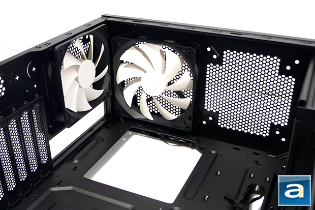 As mentioned earlier, NZXT only provides two fans for the chassis. Both of them are located in the top back corner around the CPU. This means the rest of the chassis won't have very much airflow, but this isn't a huge issue, as most of the heat generated inside of a computer is from the processor or graphics card anyway. Both of the fans used in this location are rated at 1200 RPM, and have their wires sneak out to the back of the motherboard tray. I'm very happy this was already done, as it saves me some effort trying to ensure good cable management when installing my computer components. Around this area, you can also see the opening at the back of the CPU location. The benefit of this is to allow for plenty of room when installing aftermarket CPU coolers that utilizes a custom backplate. Now, just below the 120mm fan at the back of the Source 220, you can see a small opening with ventilation holes similar to the ones used at all fan locations. I'm not really sure what the point of this little opening is -- I mean, it honestly is only going to provide an additional entry point for dust to your computer once again.