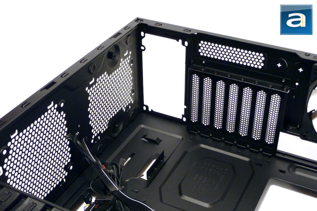 Looking down at the bottom of the NZXT Source 220, we can see where the power supply bay is placed, and the additional fan opening on the bottom. Thanks to the reasonably large opening in this location, all of the power supply cables can be easily put through it. This means mounting a fan along the bottom of the case can be done without any worry of a loose PSU cable accidentally clipping the fan. The power supply area has risers along the bottom and side to ensure a secure fit when you install the unit. Looking over at the mounting holes for the motherboard, I am very glad to find they are labeled, so that you can easily check to see where you will need to install the risers. I'm sure more experienced people will be able to eyeball it just like me. However, for those who are new to installing motherboards, you won't have to worry about putting the riser screws into the wrong place, and adjusting them later. A quick look at the labels and following the guide with make the task painless. The expansion slots on the Source 220 are mesh instead of the solid metal sheets used for the Source 210 Elite, as mentioned on the previous page. I really don't see this as an improvement; there is no fan nearby, which simply means it is an entry point for dust and nothing more. Maybe you could argue it improves cooling for the graphics card, but I really doubt it has too much of an effect. I was actually surprised at the fact that expansion slots use screws, but the 3.5" and 5.25" drive bays are tool-free. I think NZXT should have just added tool-free expansion slot clips, and advertised the whole chassis as such. It is kind of like someone who went out of the way to buy a really nice set of rims for their car, but only to cheap out and not buy locking nuts.