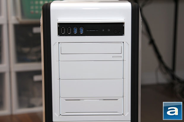 The uppermost 5.25" door is actually a rotating cover that encloses an array of front panel connections. It is not very conveniently accessible (Especially if your computer is on the floor), but I don't think it will pose a huge issue for most people down the road. To list everything present on the NZXT Switch 810's front panel starting from the left, we have two USB 2.0, two USB 3.0, one SD card slot, two 3.5mm jacks for headphone and microphone, reset button, and rear LED switch. The NZXT Switch 810's USB 3.0 ports are connected internally. If your motherboard does not have any internal USB 3.0 headers, then you are out of luck -- a USB 2.0 adapter is not included. A white HDD LED, power button, and power LED is located at the top of the case, and we will grab you a photo of the sleek implementation on Page 4 of this review.