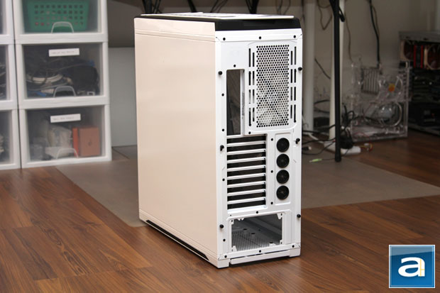 Complementing the pure and white right side panel, the back of our white NZXT Switch 810 is color matched for an extra touch of excellence. The rear layout is pretty much standard for a case with a bottom mounted power supply bay. We can expectantly spot an included black and white colored 140mm fan placed adjacent to the motherboard I/O backplate, with four pre-drilled water cooling holes in a vertical array right under. Your fingers are protected from the rear exhaust fan by a honeycomb mesh grille. A series of rails adjacent to the rear exhaust fan mount provides tons of flexibility in accommodating either two 120mm fans or one 140mm fan in the position of your choice. The expansion slot covers are fully ventilated as well, as shown in our photo above.