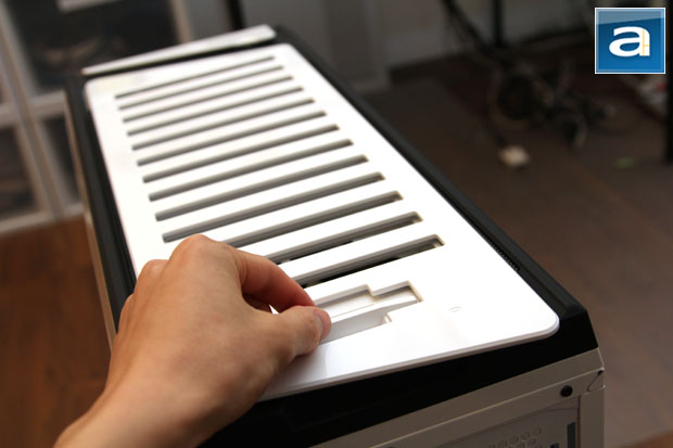 Besides the windowed side panel done exactly the way it is meant to be, there is another crucial element that NZXT got right in the Switch 810 in my personal opinion -- the top. While it is hard to argue against the laws of physics -- where heat rises, so exhaust fans are installed at the top -- most manufacturers conveniently 'forgets' how dust can really be a nuisance for many consumers such as yours truly. Of course, they argue that the top ventilation system blows air out, so it is not like dust will be sucked into the case. But how about when the computer is turned off? Oops. Well, with the Switch 810, it comes with one of those features that will probably send other case designers thinking, "Why didn't I think of that earlier?" A simple array of vents, kind of like something you would see in your house, is attached to a mechanical slider that can be opened or closed at your convenience. My beautiful hand shown in the photo is not included. The entire panel can be removed by a pair of click-locks. Up to three 120mm or 140mm fans can be installed in this location. My only suggestion for improvement is to have dust filters here like the Cooler Master 690 II, but it is not really a big deal.