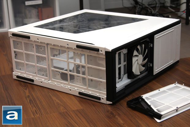 Two full-length rails support the NZXT Switch 810 off the ground, giving it a 1cm rise above the residing surface. Like the front air intake, the company has two separate removable fan filters to reduce dust from entering your power supply and bottom mounted case fans. These filters are clicked into place, and are very important, considering the entire bottom of the case is ventilated. The front panel can also be removed by giving it a nudge at the top to disengage the lock, as shown in our photo above. The click locks are definitely very convenient to use, but can be a real nuisance if you travel to LAN parties frequently with this case. Both the bottom and the front can accommodate up to two 140mm fans each.