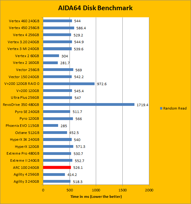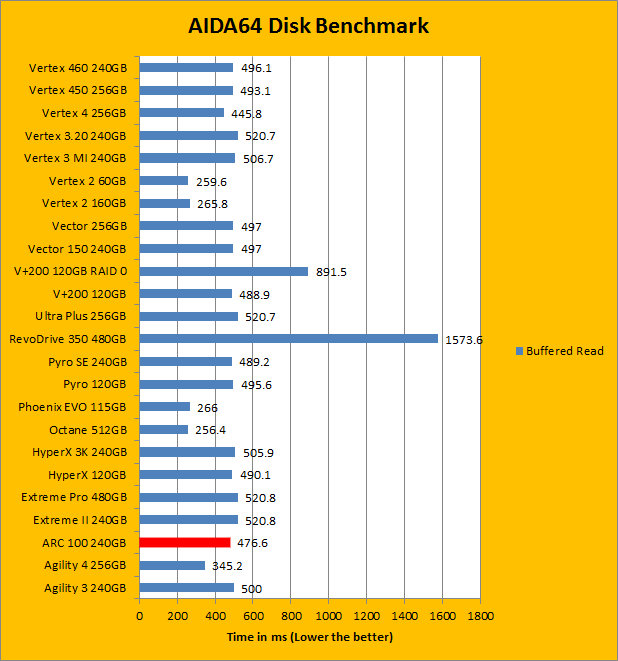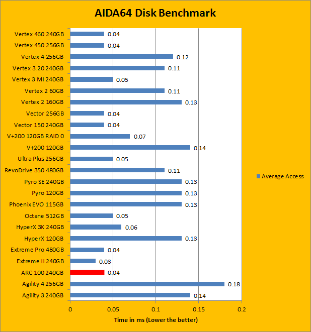 If you have read our past reviews, whether we are testing hard drives, USB sticks, or solid state drives, you will know AIDA64 is one of our most used tests. AIDA64 Extreme Edition is a completely synthetic benchmark in that it does not necessarily completely reflect real life performance. However, what it does provide is an insight into the performance between different drives and different controllers. In the results we have obtained above, you can see the Barefoot 3 based OCZ ARC 100 240GB is not as close to its brothers, the Vector 150, or the Vertex 460. The ARC 100 pulled 525.3MB/s for linear read, 526.1MB/s for random read, and 476.6MB/s for buffered read. This puts the ARC100 more in line with the Vertex 4 256GB from 2012, which is not a bad place considering the price. As for average access time, the OCZ ARC 100's 0.04ms is in line with the other Barefoot 3 drives we have seen.