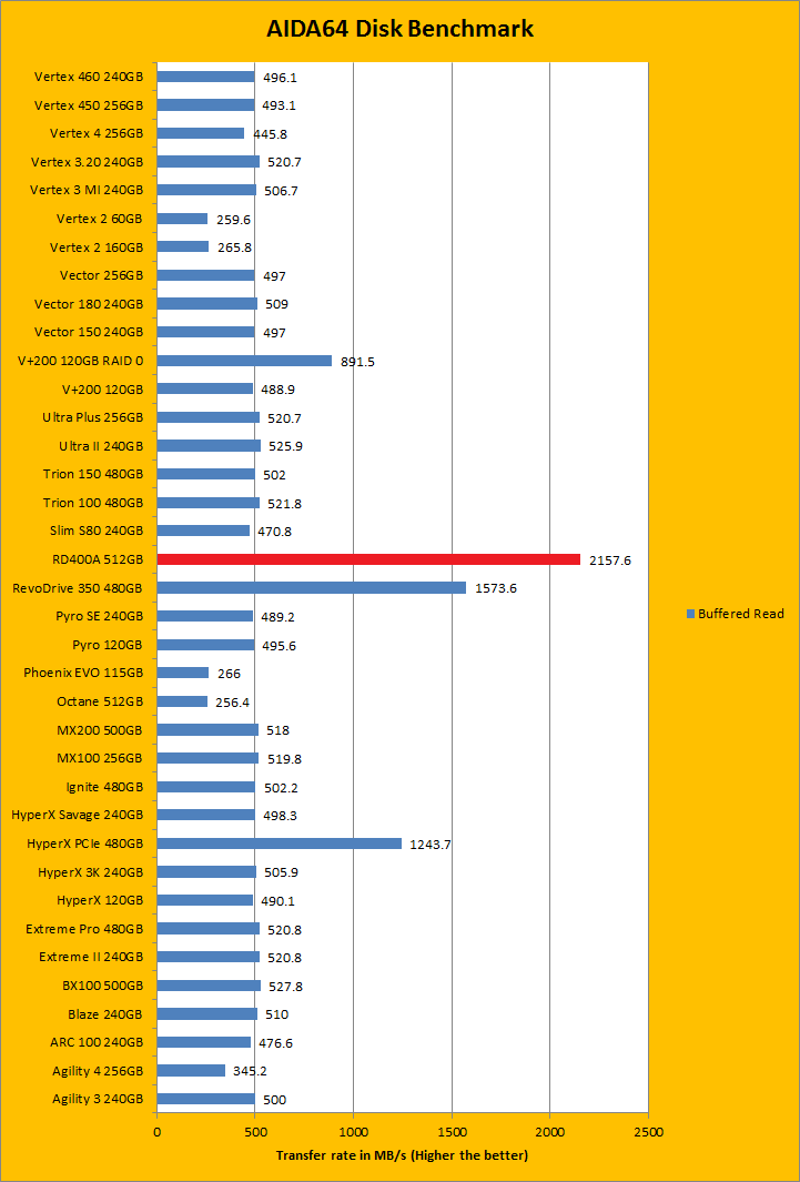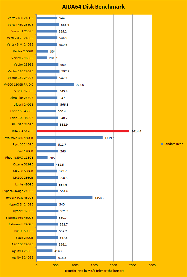 Since our SSD review benchmark results are presented in alphabetical order, first up on the list are results from one of our favorite benchmarking programs, AIDA64 Engineer. Just to note, AIDA64 Engineer is a full synthetic benchmark. Unlike full synthetic motor oil, this usually does not always carry a good connotation. While it is not a representation of real life performance (Such as how fast Photoshop opens), it does provide valuable insight into performance between different drives and different controllers. As you can see in our graphs above, the OCZ RD400A 512GB was by far the fastest SSD tested in AIDA64 here at APH Networks. The NVMe RD400A came in at 2633.8MB/s peak in the linear read benchmark, while the quad RAID 0 based OCZ RevoDrive 350 480GB posted a 1814MB/s peak, and the Kingston HyperX Predator PCIe 480GB came in third at 1431.2MB/s in the same benchmark. A similar story is repeated for Buffered Read and Random Read. The tested random access time was 0.02ms, which is among the lowest. The rest of the comparison results against all the other drives can be seen in our graphs above.