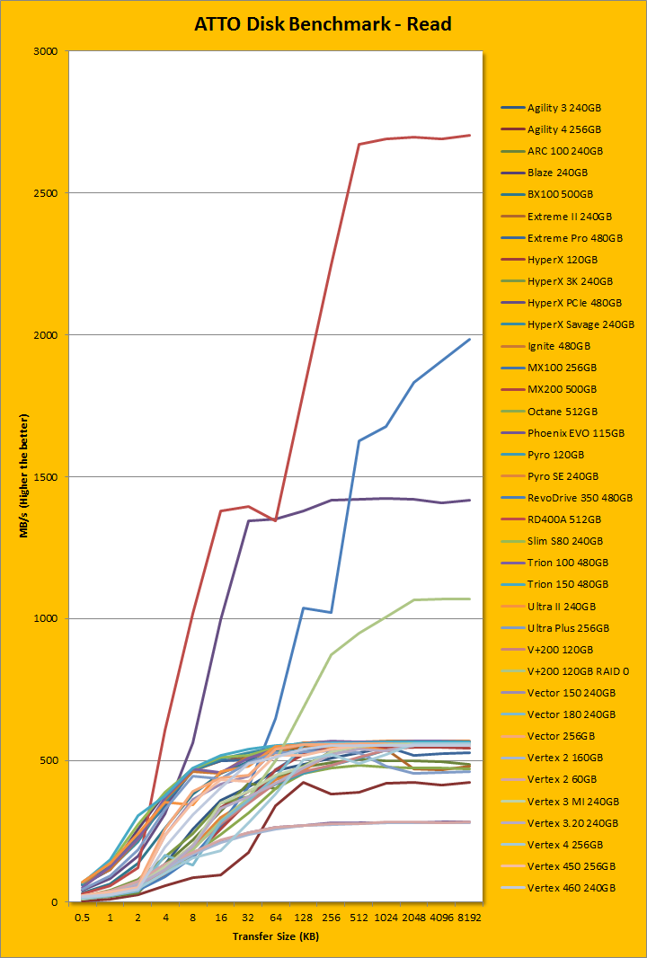 Following up next is our usual ATTO read and write tests. ATTO is an often quoted benchmark, because it is easy to use and accurate. For the most part, it is a favorite among reviewers, and I have grown to embrace it as much as the next for the last little while. ATTO uses easily compressible data, so SandForce based SSDs and similar will perform very well here; as far as the OCZ RD400A is concerned -- well, here are our results. As manufacturer peak read and write performance ratings are usually obtained using ATTO, whether a drive lives up to its marketing claims or not can be validated by this program. OCZ claims the OCZ RD400A 512GB's maximum read and maximum write are pinned at 2600MB/s and 1600MB/s, respectively. According to our tests, these numbers were slightly underrated. It peaked at 2704.14MB/s read and 1600.847MB/s write. This is the best we have ever seen on this website. Under the curve, things looked a little fit funky. In the write category, we have seen faster ramp ups from 0.5K to 2K, but from then on, it quickly reached an impressive 919.519MB/s at 8K. The RD400A reached pretty much peak speed starting at 16K, which was quite mind blowing. In the read category, a similar observation could be observed. It was no match against the Kingston HyperX Predator PCIe 480GB's unbelievably fast 0.5K to 2K, but beyond that, the RD400A almost doubled the HyperX Predator at 4K with a whopping 606.559MB/s throughput, and broke the 1GB/s barrier at 8K. Meanwhile, the RevoDrive 350 purred along at the back at 90.413MB/s and 159.644MB/s at 4K and 8K, respectively. The RD400A 512GB was absolutely untouchable -- including the mighty OCZ RevoDrive 350 480GB -- across the entire board. Needless to say, the OCZ RD400A 512GB is the undisputed king in ATTO so far here at APH Networks.