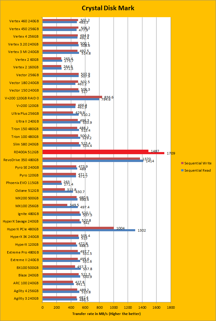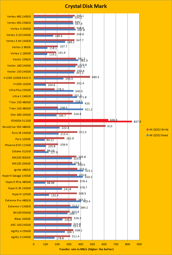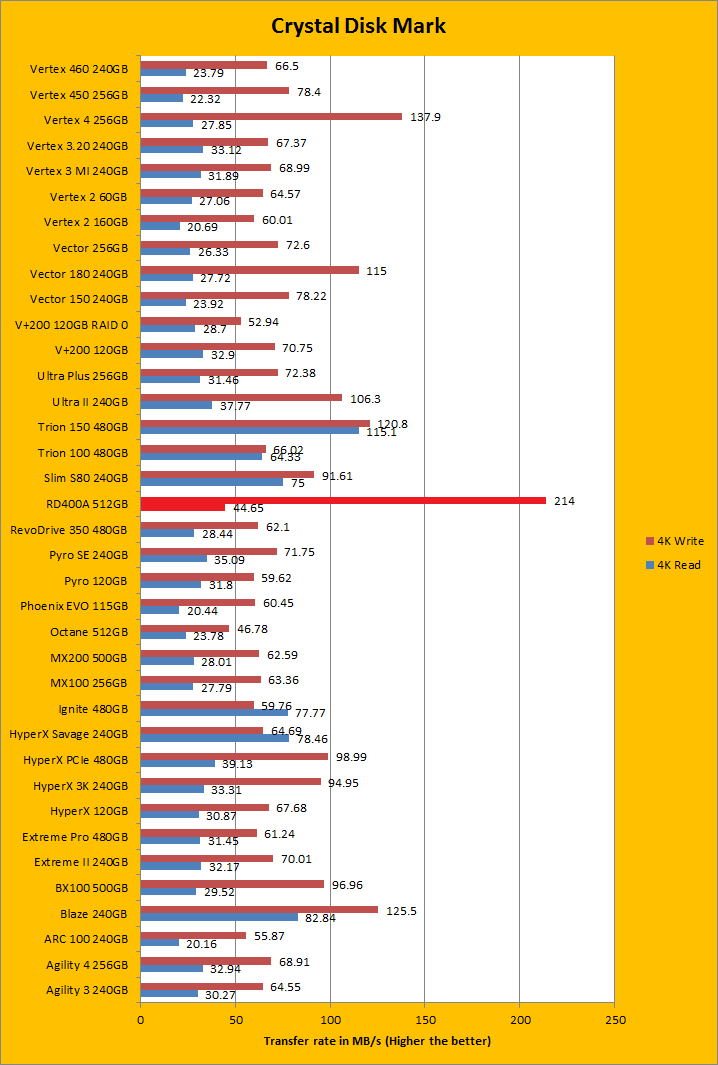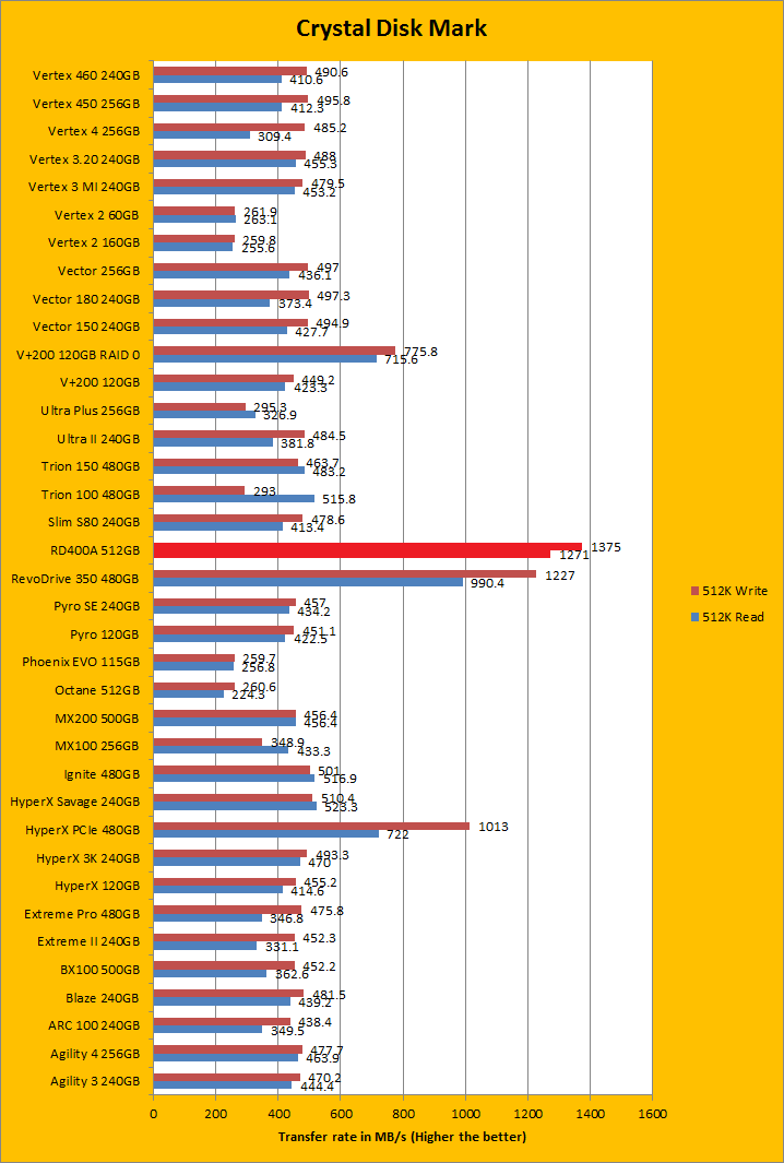 Crystal Disk Mark 3.0 is in the spotlight. Just a bit of background information; higher capacity drives tend to perform a little better in these tests. The ability of a controller and flash memory to deliver high IOPS will provide huge benefits to the score as well. As you can see in our charts above, once again, the OCZ RD400A 512GB was by far the fastest SSD by a very wide margin in almost every category. The only test the OCZ RD400A was not able to take home the crown was the 4K read results. Other than that, it totally blew away everything that came before it -- whether it be sequential read/write, 512K read/write, or 4K QD32 read/write. It totally owned the 4K write test, too. If words cannot describe how fast this SSD is, a comparison against everything we have tested here at APH Networks since 2010 will. I will let you check out our massive comparison graphs above.