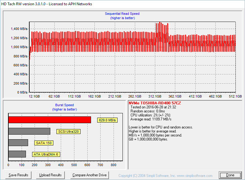 After giving the OCZ RD400A 512GB a clean format and ensuring alignment and everything is correct, I fired it up for some testing in HD Tach. While HD Tach is more of a 'drag race' than a clear indication of real life performance, and has been around for a really long time, it is an excellent storage performance reference among SSDs with the same controller, and has been our favorite benchmark long before hard drives even cracked the 50MB/s mark. With an average read speed of 1109.7MB/s according to HD Tach in single disk configuration, this is by far the best score we have ever seen here at APH Networks (The SanDisk Ultra II 240GB is the fastest single SATA 6Gb/s disk at 469.3MB/s, while the Kingston HyperX Predator PCIe 480GB came in at 770.4MB/s). For most solid state drives, we typically look for something that is faster than 350MB/s. From our experience, most drives do not crack the 400MB/s line. At the end of the day, HD Tach may not be the best test for solid state drives all the time, but we really cannot argue against the results.