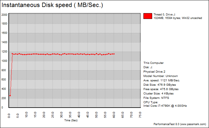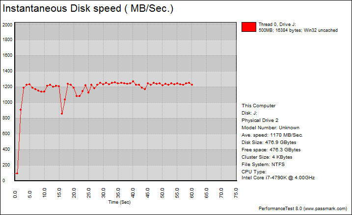PassMark PerformanceTest 8.0's Advanced Disk Test, unlike HD Tune Pro 4.60, generates some awesome graphs right out of the box. It also provides valuable insight in simulating real world performance applications. To make things clear to you, the first graph simulates a database server, followed by a file server, web server, and workstation. Obviously, PassMark PerformanceTest 8.0 uses highly compressible data in most tests some controllers can really take advantage of. However, it also requires high IOPS capabilities for the best score. Many of the latest SSD controllers perform pretty well in this test. One thing clear is the OCZ RD400A 512GB provided incredibly flat graphs, which is excellent if you are looking for consistent performance.