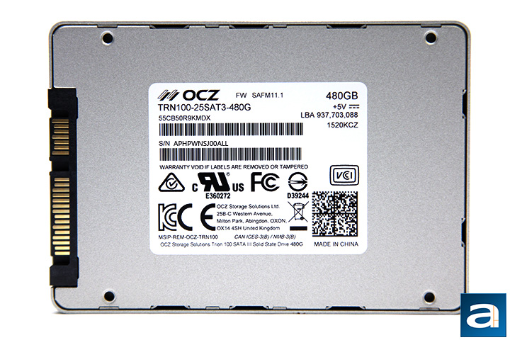 As always, before we move onto the fancy technical details about OCZ's latest value oriented solid state drive based on the Toshiba TC58 controller, let us briefly discuss the physical attributes of this SSD first. The OCZ Trion 100 takes on the new design language we have seen with the OCZ ARC 100 240GB my colleague Aaron Lai reviewed in October 2014, and the OCZ Vector 180 240GB I reviewed about three months ago. Featuring rounded corners and a large label with OCZ's branding and logo covering the entire front surface, the graphics on the OCZ Trion 100 480GB is a clean and good looking. You can discern between product lines based on the color scheme used. This white label on top of the flat aluminum cover is present to ensure the user will make no mistake that this is a Trion 100 series drive, but you will not find its capacity until you look at the back.