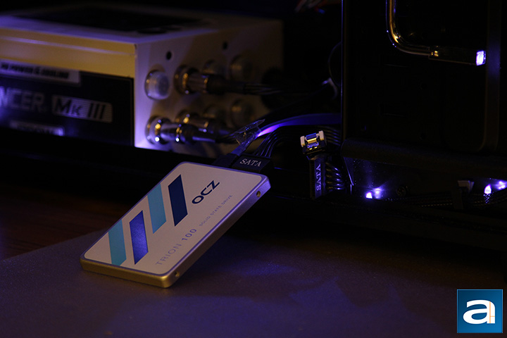 Measuring in at 100mm wide, 69.85mm deep, and 7mm tall, its thickness -- or lack thereof -- will ensure wide compatibility. It is also very light at 48g, which is less than half the weight of other OCZ drives we have seen in the past. OCZ Trion 100 drives will have no problems fitting into your laptop hard disk bay if you want to boost mobile computing performance, considering pretty much all new laptops have 7mm bays. On the other hand, if you want to use it in your desktop and your chassis has no 2.5" mount, then you will need to find your own solution, since the OCZ Trion 100 comes with no accessories. Nowadays, it is hard to find a case without a 2.5" drive bay, and considering this is a barebones value drive, I am not complaining.
