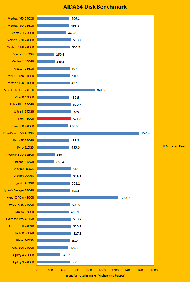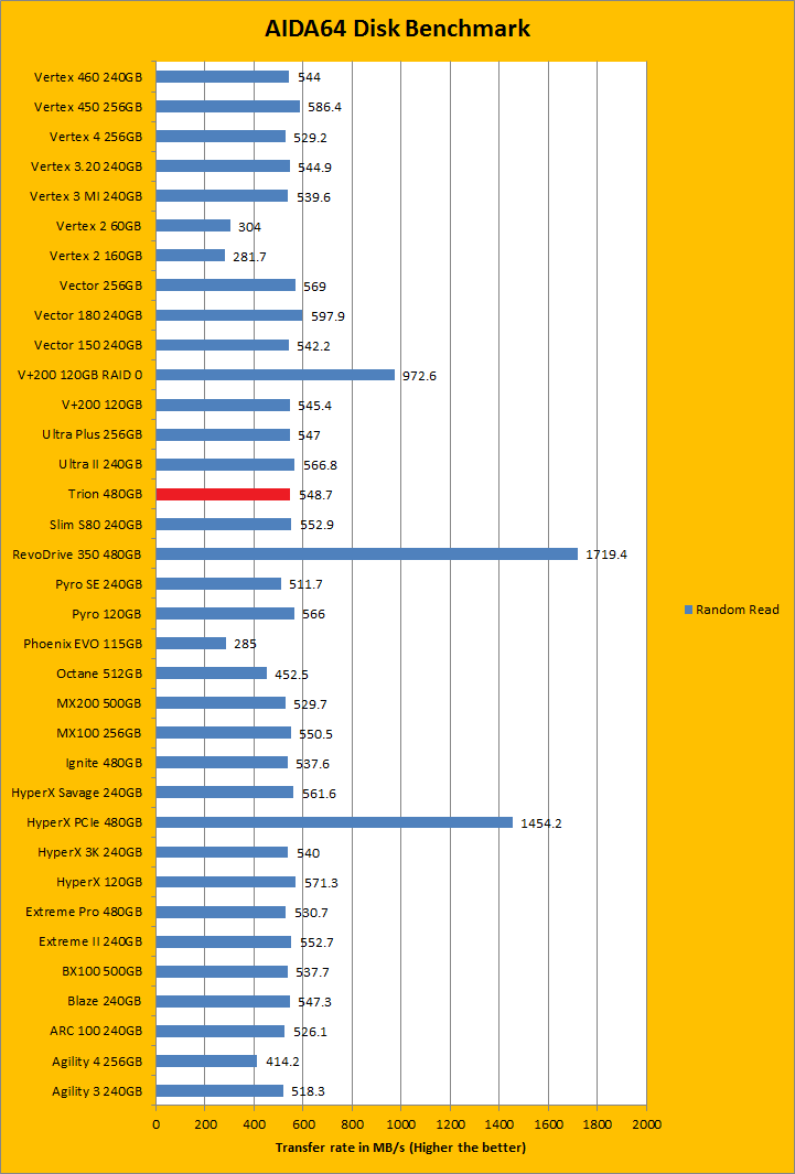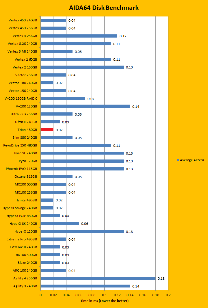 Since our SSD review benchmark results are presented in alphabetical order, first up on the list are results from one of our favorite benchmarking programs, AIDA64 Engineer. Just to note, AIDA64 Engineer is a full synthetic benchmark. Unlike full synthetic motor oil, this usually does not always carry a good connotation. While it is not a representation of real life performance (Such as how fast Photoshop opens), it does provide valuable insight into performance between different drives and different controllers. As you can see in our graphs above, the OCZ Trion 100 480GB was very similar to the Patriot Ignite 480GB, another drive we suspect has a similar controller under the hood but with different flash memory, with a slight advantage given to the Trion 100. Compared to other budget oriented drives in the category, the Trion 100 remains to be competitive. The tested random access time was 0.02ms, which is one of the lowest we have ever seen. The rest of the comparison results against all the other drives can be seen in our graphs above.