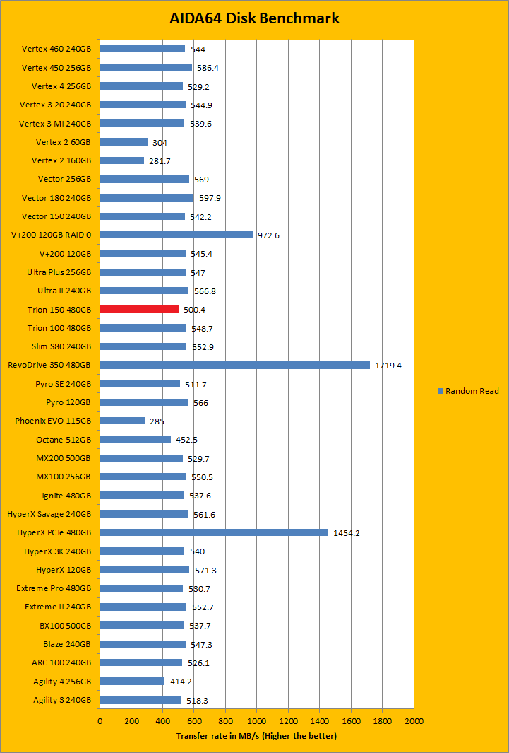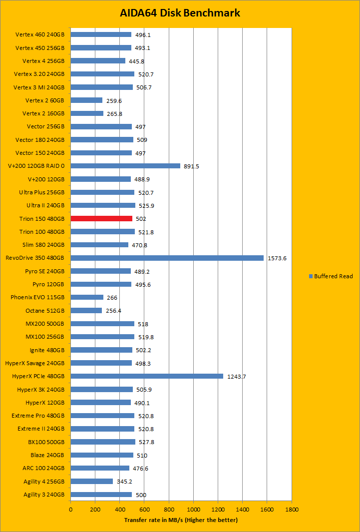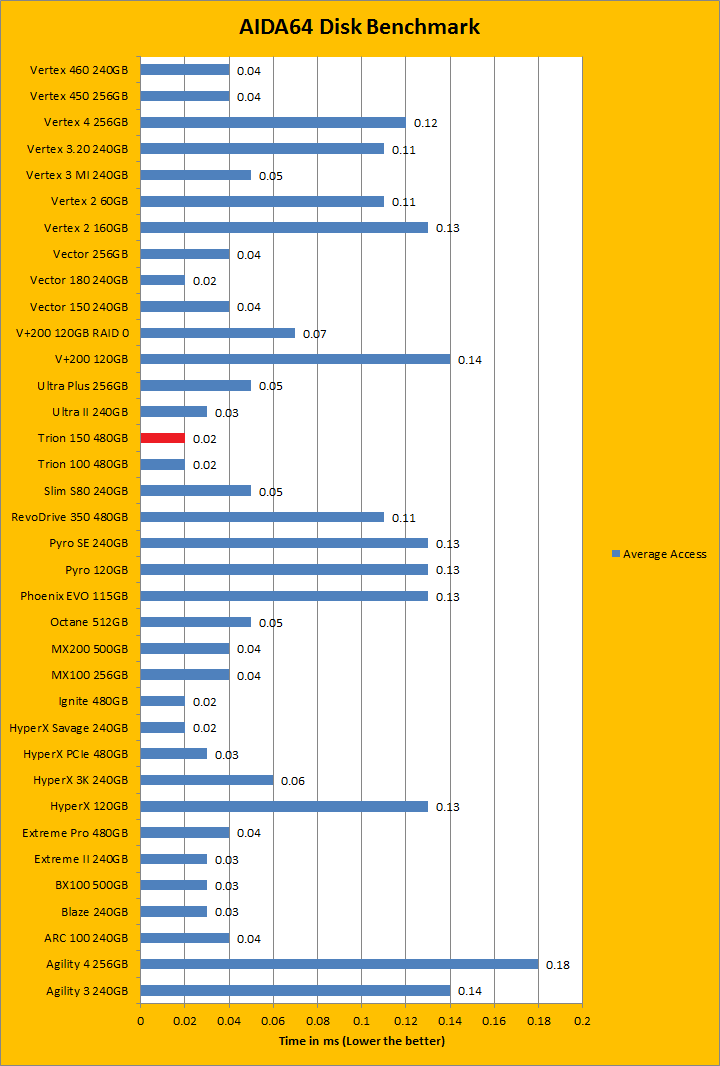Since our SSD review benchmark results are presented in alphabetical order, first up on the list are results from one of our favorite benchmarking programs, AIDA64 Engineer. Just to note, AIDA64 Engineer is a full synthetic benchmark. Unlike full synthetic motor oil, this usually does not always carry a good connotation. While it is not a representation of real life performance (Such as how fast Photoshop opens), it does provide valuable insight into performance between different drives and different controllers. As you can see in our graphs above, the OCZ Trion 150 480GB was very similar to the Trion 100 480GB, with a slight advantage given to the Trion 100. Compared to other budget oriented drives in the category, the Trion 150 remained to be competitive. The tested random access time was 0.02ms, which is one of the lowest we have ever seen. The rest of the comparison results against all the other drives can be seen in our graphs above.