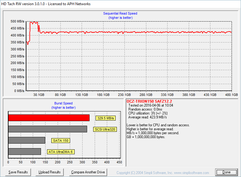 After giving the OCZ Trion 150 480GB a clean format and ensuring alignment and everything is correct, I fired it up for some testing in HD Tach. While HD Tach is more of a 'drag race' than a clear indication of real life performance, and has been around for a really long time, it is an excellent storage performance reference among SSDs with the same controller, and has been our favorite benchmark long before hard drives even cracked the 50MB/s mark. With an average read speed of 423.9MB/s according to HD Tach in single disk configuration, this is a pretty good place to be at; edging out the OCZ Trion 100 480GB (The SanDisk Ultra II 240GB is still the highest scoring at 469.3MB/s). For most solid state drives, we typically look for something that is faster than 350MB/s. From our experience, many drives do not crack the 400MB/s line. At the end of the day, HD Tach may not be the best test for solid state drives all the time, but these results are always interesting to look at.
