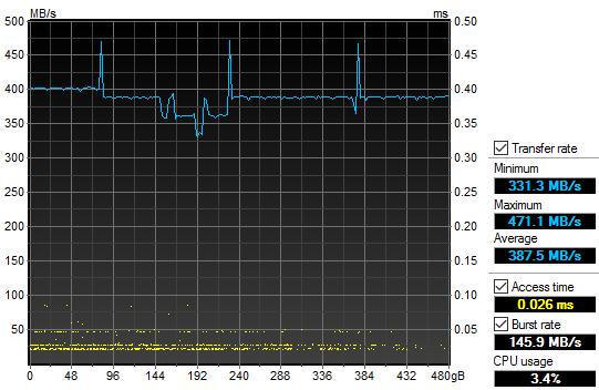 Unfortunately, HD Tune does not generate any fancy independent graph outputs in particular, so I had to edit my screenshot out a bit to make it look better for publishing in a review. Unlike our HD Tach results on the previous page, the line was a bit bumpy, but remained fairly flat on average. It differs slightly in magnitude than the other program -- probably due to testing algorithms used -- but its performance characteristics are identical in practice. Other than that, the results were commendable across the range; the recorded access time was very low, as we would expect from a solid state drive. The OCZ Trion 150 480GB posted roughly similar results otherwise for the sequential read speed, except its average was slightly below the Trion 100 in the same test this time. Do keep in mind the discussion we had on the previous page, as it still applies here.