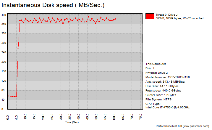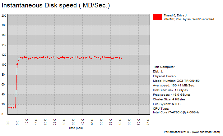 PassMark PerformanceTest 8.0's Advanced Disk Test, unlike HD Tune Pro 4.60, generates some awesome graphs right out of the box. It also provides valuable insight in simulating real world performance applications. To make things clear to you, the first graph simulates a database server, followed by a file server, web server, and workstation. Obviously, PassMark PerformanceTest 8.0 uses highly compressible data in most tests some controllers can really take advantage of. However, it also requires high IOPS capabilities for the best score. In the past, Marvell and Indilinx based drives perform pretty well in this test. One thing clear is the OCZ Trion 150 480GB provided incredibly flat graphs, which is excellent if you are looking for consistent performance.