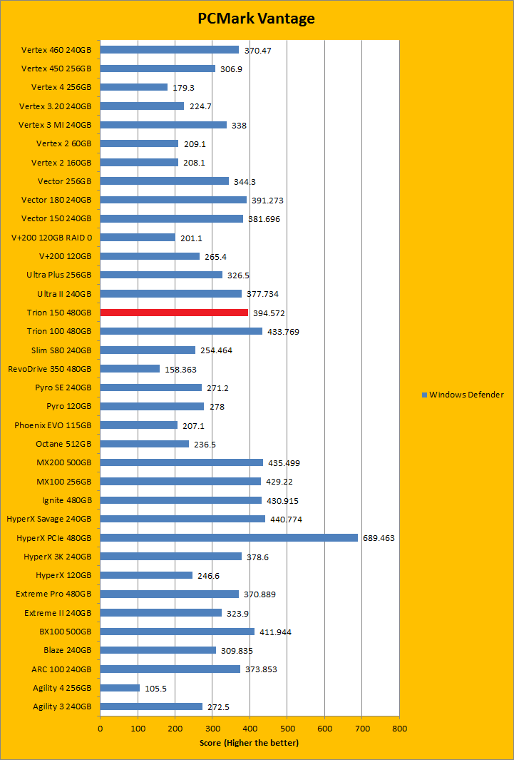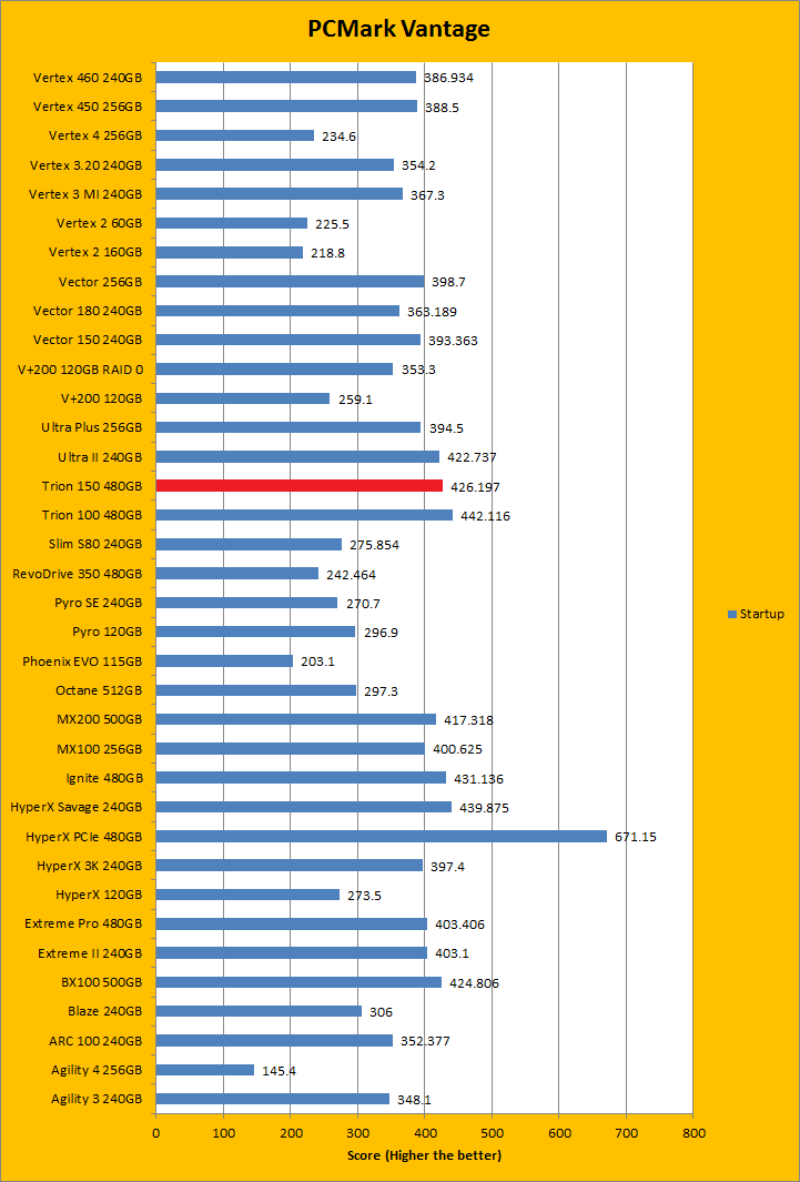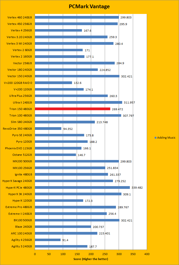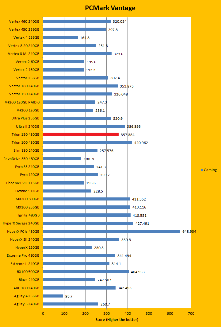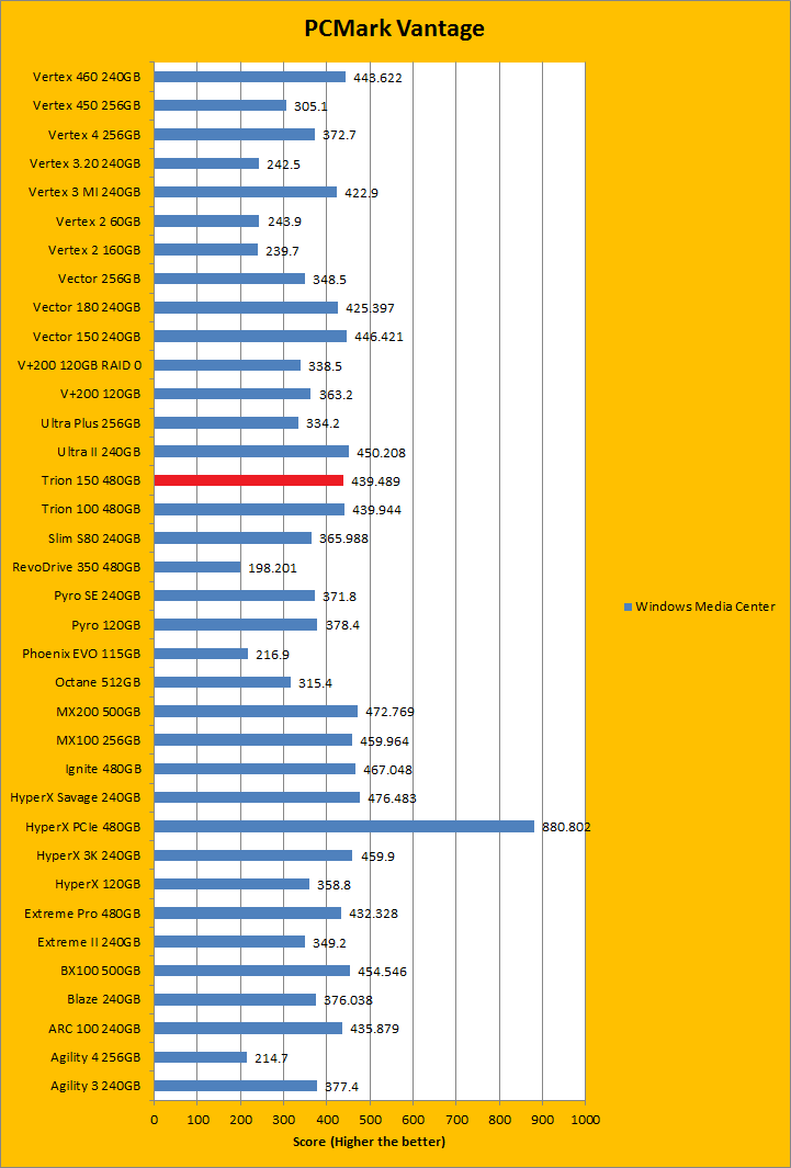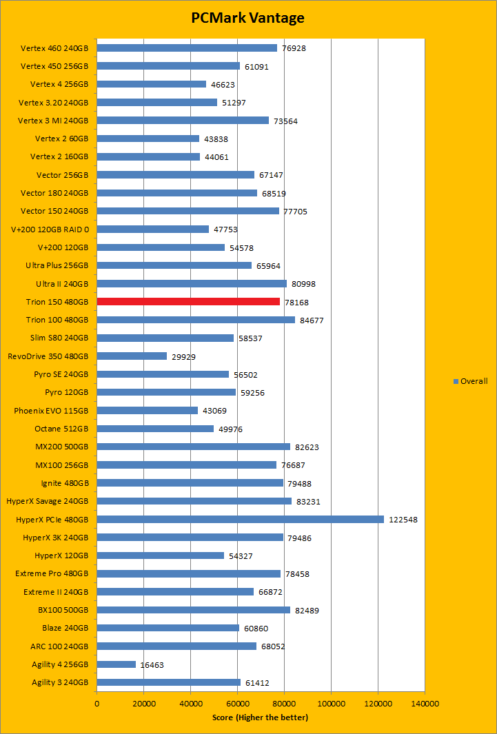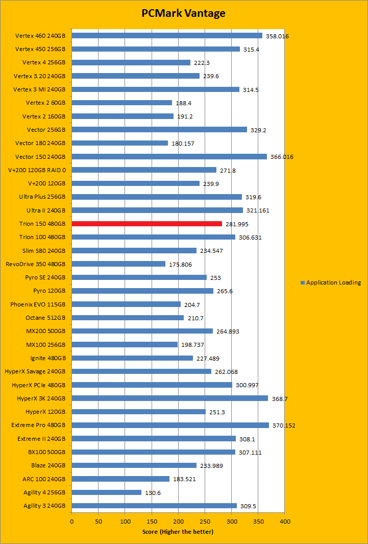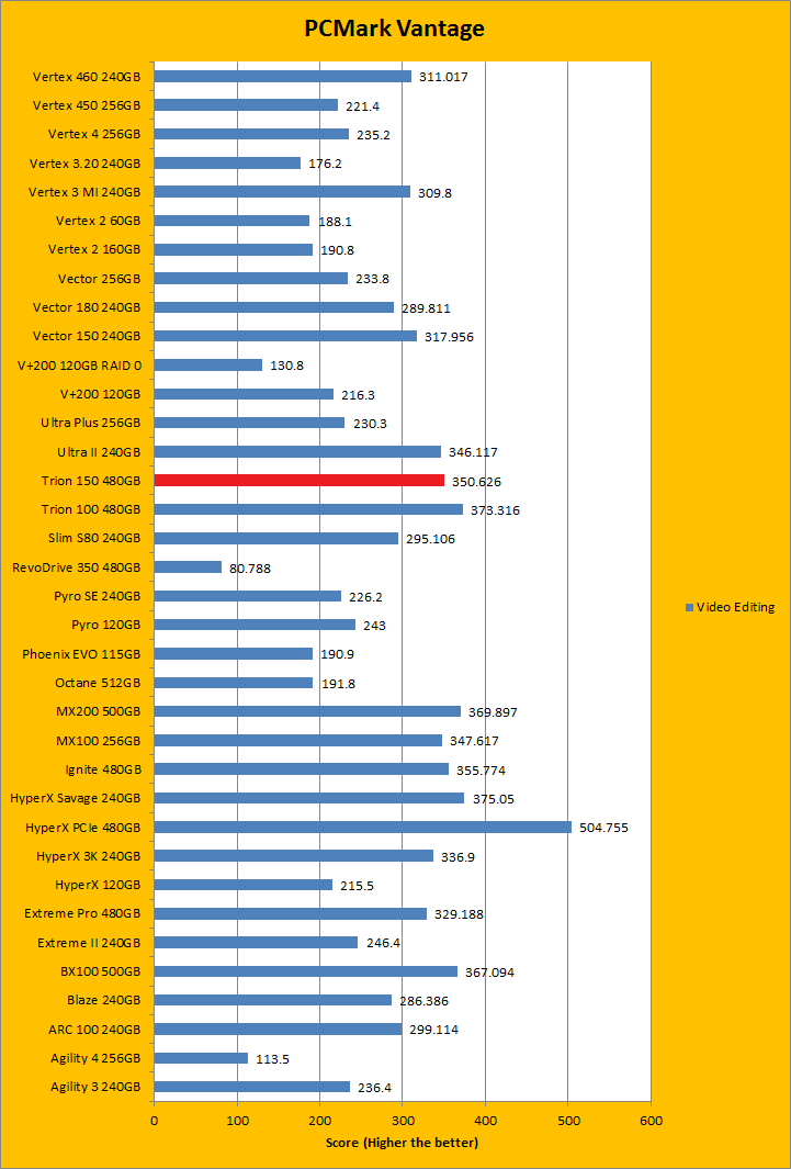 PCMark Vantage aims to shed a little more insight into real life performance of your computer hardware by semi-synthetic means -- and all insight is good, right? The great thing about standardized tests is anyone can repeat them and get very similar results, given identical hardware. Well, I am not going to narrate the stuff above in detail, because we all know graphs are there for a very good reason. Just to give you a bit of insight if you are too lazy to go through all nine comparisons, the OCZ Trion 150 480GB delivered an overall score among the top for a SATA 6Gb/s drive; but fell behind the original Trion 100. PCMark Vantage uses some pretty simple simulations, so it is pretty optimized for drives with relatively fast linear read (It does funny things when you got a SandForce RAID array though). The results were pretty good. In the subcategories, the OCZ Trion 150 480GB was slower than its predecessor by various margins in every category. On average, the difference was not big, and the general performance was very commendable in PCMark Vantage.