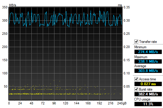 Unfortunately, HD Tune does not generate any fancy independent graph outputs in particular, so I had to edit my screenshot out a bit to make it look better for publishing in a review. Again, like our HD Tach results on the previous page, the line was a bit bumpy, but remained fairly flat on average. It differs slightly in magnitude than the other program -- probably due to testing algorithms used -- but its performance characteristics are identical in practice. Other than that, the results are commendable across the range; the recorded access time was very low, as we would expect from a solid state drive. The OCZ Vector 180 240GB posted roughly similar results otherwise for the sequential read speed. Do keep in mind the discussion we had on the previous page, as it still applies here.