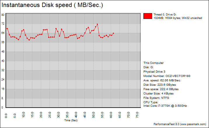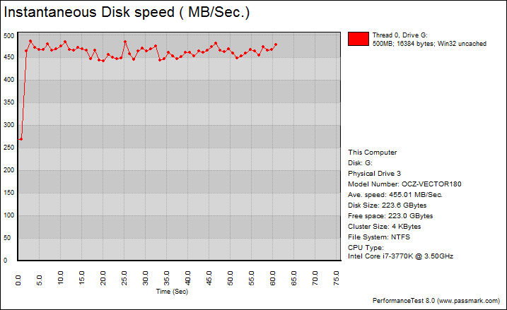 PassMark PerformanceTest 8.0's Advanced Disk Test, unlike HD Tune Pro 4.60, generates some awesome graphs right out of the box. It also provides valuable insight in simulating real world performance applications. To make things clear to you, the first graph simulates a database server, followed by a file server, web server, and workstation. Obviously, PassMark PerformanceTest 8.0 uses highly compressible data in most tests some controllers can really take advantage of. However, it also requires high IOPS capabilities for the best score. In the past, SandForce, Marvell, and Indilinx based drives all perform pretty well in this test. One thing clear is the OCZ Vector 180 240GB provided incredibly flat graphs, which is excellent if you are looking for consistent performance.