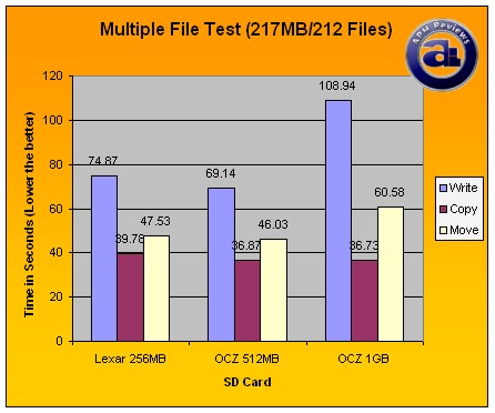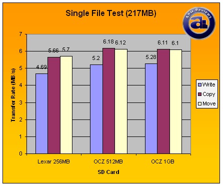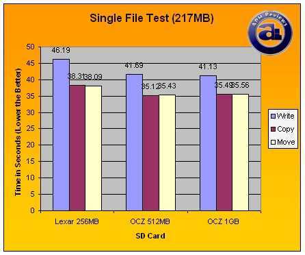 In our single 217MB file test, both OCZ card's performances are nearly identical. According to our results, the OCZ SD cards consistently bested the Lexar 256MB SD card by roughly 3 seconds each time.