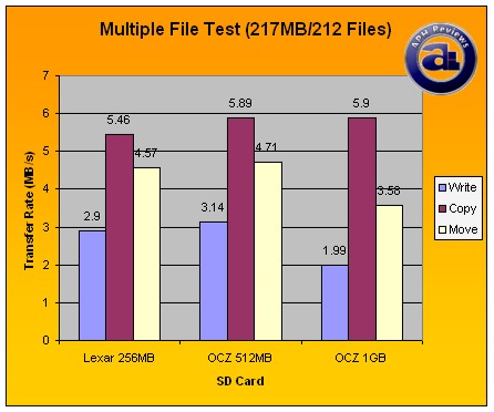 Surprise, surprise. OCZ's 512MB card went neck to neck with my two year old Lexar 256MB card (Which to my knowledge did not claim any "high-speed" performance). Although consistently beating the Lexar card by a handful of seconds each time, it wasn't very significant when we put it into megabytes-per-second. However, when it came to our OCZ 1GB card, it suffered very horribly writing over 200 separate files at a time -- finishing at 108.94 seconds, it was clearly beaten by both Lexar 256MB and OCZ 512MB cards; finishing off at 74.87 seconds and 69.14 seconds, respectively. Although it performed slightly better than its 512MB counterpart by a few milliseconds in APH's copy tests, the OCZ 1GB SD card's move test trailed behind other cards at a file moving rate of 3.58MB/s.