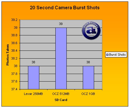 Using our Canon SD300 digital camera, we tested if the OCZ SD cards offered any performance gain in taking burst shots. At 2272x1704 (4 megapixels) with compression setting on Fine and flash disabled, we took our photos in exactly the same position each time at the same things to maintain a benchmark as accurate as possible (As far as out consumer camera can take us anyway). We gave the camera exactly 20 seconds to take as many burst shots as possible. Again the OCZ SD cards showed no real performance gain than the Lexar product -- except for the fact that the OCZ 512MB card finished off with one more photo.