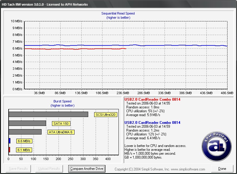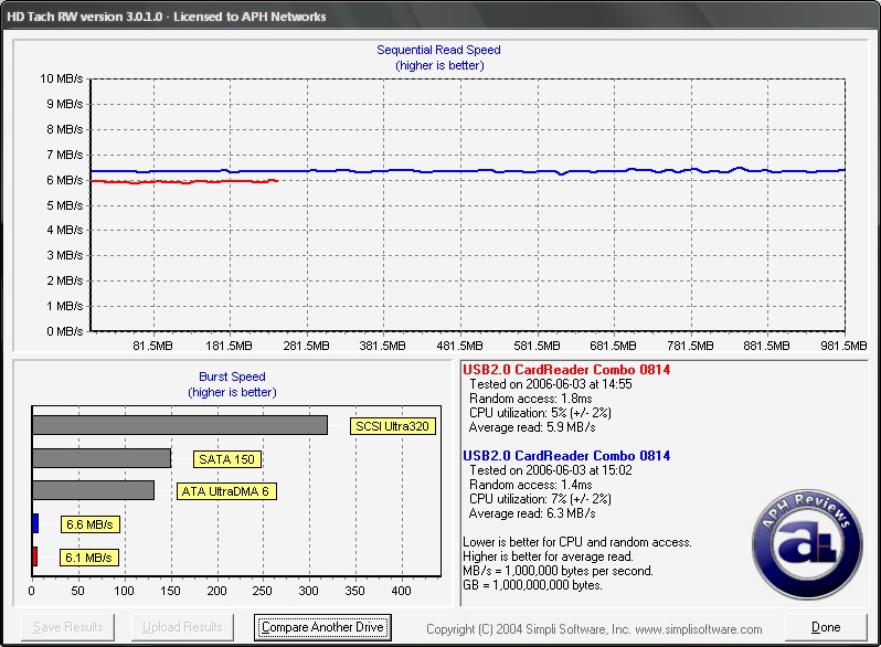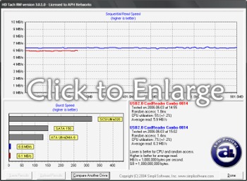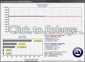 According to HDTach, the OCZ SD cards did perform consistently better than the Lexar 256MB card, although not by a whole lot. When comparing OCZ's 512MB SD card against the 1GB SD card, performance was nearly identical; except our chart indicates OCZ's 512MB card has an average read of 0.1MB faster.