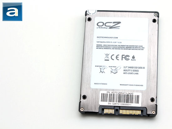 Turning the SSD around reveals a familiar metal backplate -- except this time, there is no exposed printed circuit board like you would normally see with a traditional hard disk drive. The only thing that is common between the Agility 3 SSD and a traditional hard disk drive is its SATA 6Gb/s and corresponding power connector at the end. As shown in our photo above, you will find a large label with the usual series certification logos and warning statements, along with information on drive model and capacity. In case you missed it, our particular unit is the OCZ Agility 3 240GB, haha. The smaller adjacent label with a barcode has the SSD's part number and serial number printed on it. As with all OCZ SSDs, they are all made in Taiwan, and this one is no exception.