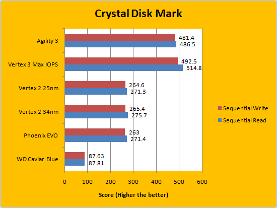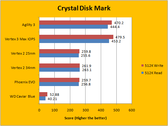 Up next is Crystal Disk Mark 3.0. While it was very surprising that OCZ's Agility 3 240GB looked very similar to the OCZ Vertex 3 Max IOPS 240GB in very compressible data, we can now observe some variation between the two here. Crystal Disk Mark tests with data that's not very compressible, and as shown in our graphs above, the Vertex 3 Max IOPS consistently outperformed the Agility 3 by a small margin. Again, the difference is not very big, but how long will this trend hold?