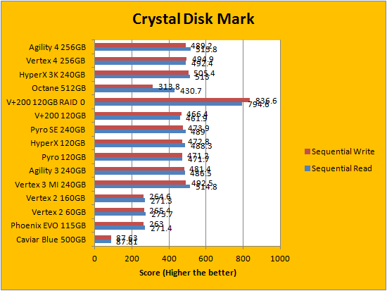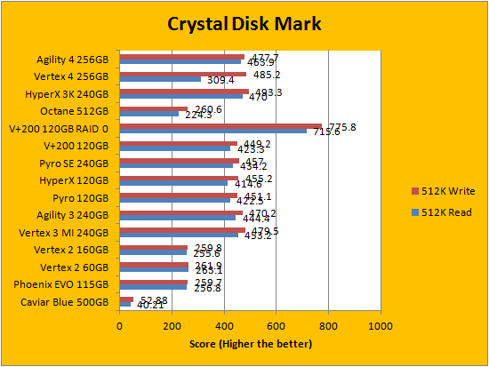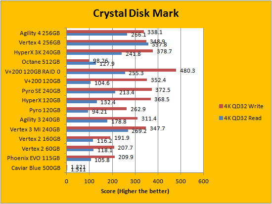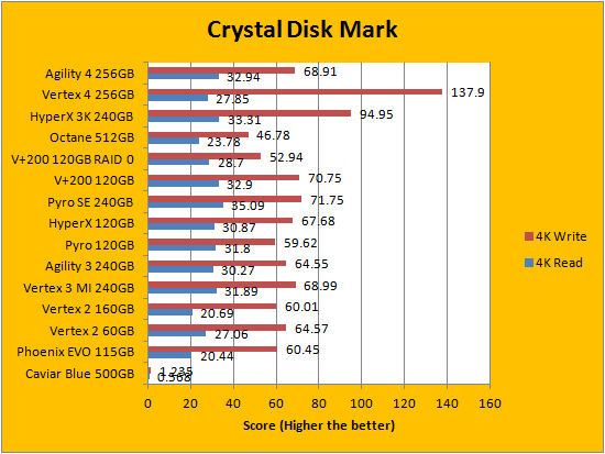 Crystal Disk Mark 3.0 is in the spotlight. Just a bit of background information; higher capacity drives tend to perform a little better in these tests. Although the OCZ Agility 4 256GB did not post earth shattering results in any of the results, the controller's ability to handle non-compressible data, and its IOPS advantage definitely put the Agility 4 among the best performing SandForce disks. As you can see in our graphs above, it was actually quite fast in a number of tests -- besting even the flagship OCZ Vertex 4 more than once. Its high IOPS capability of OCZ's controller paid off, and these are the stuff that will make a big difference in real life performance.
