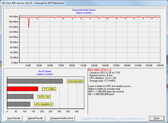 After giving the OCZ Agility 4 256GB a clean format and ensuring alignment and everything is correct, I fired it up for some testing in HD Tach. While HD Tach is more of a 'drag race' than a clear indication of real life performance, it is an excellent storage performance reference among SSDs with the same controller, and has been our favorite benchmark long before hard drives even cracked the 50MB/s mark. With an average read speed of 177.4MB/s according to HD Tach in single disk configuration, it is definitely lower than what we could normally expect for a SATA 6Gb/s solid state disk; normally we would want something over 300MB/s. Again, while it is probably not too advisable to compare drives with different controllers, it is interesting to see that the OCZ Octane 512GB actually did 335MB/s in the same test, while the Vertex 4 256GB had a respectable 309MB/s.