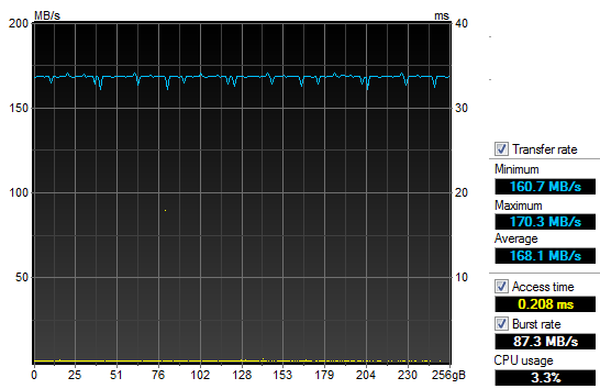 Unfortunately, HD Tune does not generate any fancy independent graph outputs in particular, so I had to edit my screenshot out a bit to make it look better for publishing in a review. Again, like our HD Tach results on the previous page, the line is nice and flat as before. It differs slightly in magnitude than the other program -- probably due to testing algorithms used -- but its performance characteristics are identical in practice. Other than that, the results are very commendable across the range; and the recorded access time is virtually nil. Again, the OCZ Agility 4 256GB posted lower than expected results, but do keep in mind the discussion we had on the previous page, as it still applies here.