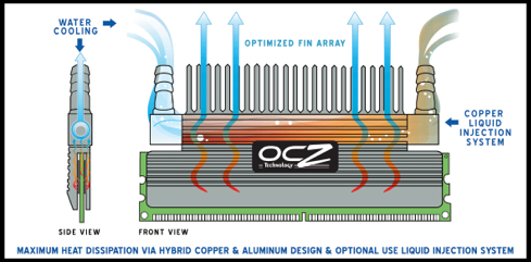 The most interesting aspect that separates the Flex XLC apart from the rest of the OCZ memory line is the heatsink. Utilizing a large aluminum heat dissipater, sets of aluminum fins set across the top in an organized array to bring heat away from the memory modules. The liquid injection system is made out of copper inside to create a copper-aluminum hybrid (Although you won't really see the copper), with an input and output on both ends of the Flex XLC heatsink.