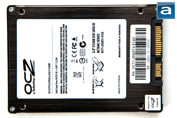Turning the SSD around reveals a familiar metal backplate -- except this time, there is no exposed printed circuit board like you would normally see with a traditional hard disk drive. The only thing that is common between the Octane SSD and a traditional hard disk drive is its SATA 6Gb/s and corresponding power connector at the end. As shown in our photo above, you will find a large label with the usual series certification logos and warning statements, along with information on drive model and capacity. In case you missed it, our particular unit is the OCZ Octane 512GB, haha. (On a side note, it is kind of scary how this SSD has a bigger capacity than most of my 2.5" hard drives we have here around APH Networks.) The smaller adjacent label with a barcode has the SSD's part number and serial number printed on it. As with all OCZ SSDs, they are all made in Taiwan, and this one is no exception.