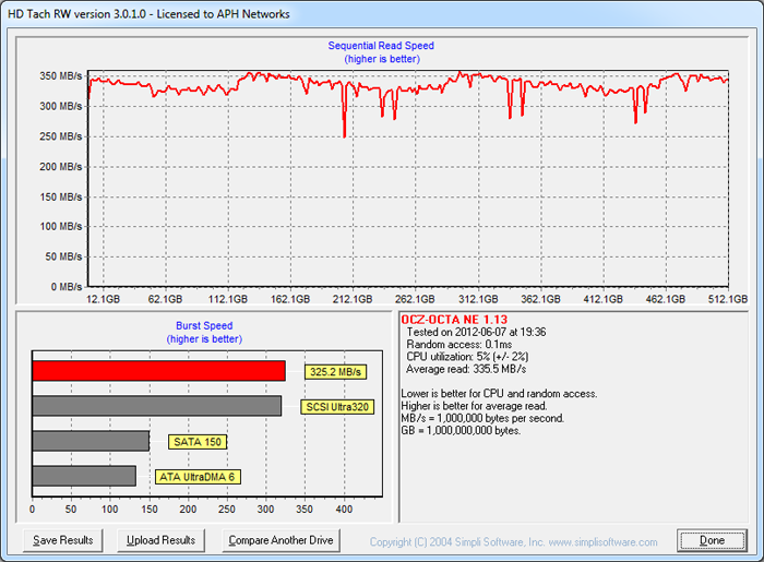 After giving the OCZ Octane 512GB a clean format and ensuring alignment and everything is correct, I fired it up for some testing in HD Tach. While HD Tach is more of a 'drag race' than a clear indication of real life performance, it is an excellent storage performance reference, and has been our favorite benchmark long before drives even cracked the 50MB/s mark. With an average read speed of 335.5MB/s according to HD Tach in single disk configuration, it is definitely within the range of what we could possibly expect for a SATA 6Gb/s solid state disk. While this is highly dependent on the controller's performance, I think OCZ did an excellent job at delivering what is classified as a "value" based chip with the Indilinx Everest -- the Octane is certainly not that far off from high performance SandForce SF-2281 based drives.