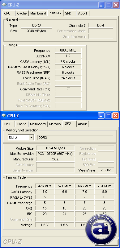 A CPU-Z screenshot of the memory tabs. I took the screenshot with latency settings at 7-6-6-24 as displayed on the label on the RAM itself, but I've followed timings on OCZ's website at 7-6-6-20 with zero problems on the Asus P5K3-Deluxe. Our Asus P5E3-Deluxe correctly detected the timings in the BIOS as 7-6-6-20 as well.