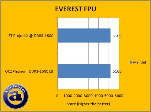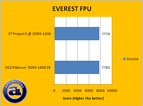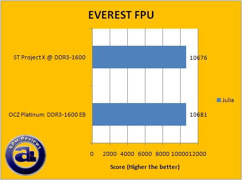 Similar conclusion can be drawn from our EVEREST 4.00 FPU benchmarks. In this section, the trend is generally the same as our CPU results with a tight match with minor differences between the two sets of RAM; we've run these benchmarks multiple times to confirm results. The OCZ Platinum PC3-12800 EB RAM and Super Talent Project X posted two leads and one lead, respectively; on the charts. Both numerical differences are insignificant and generally regarded as a statistical tie.