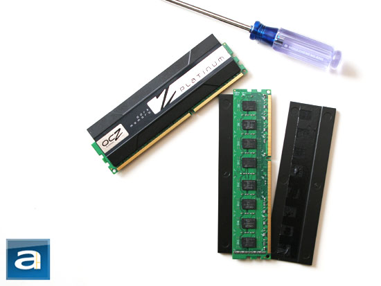 The heatspreader on the OCZ Platinum XTE RAM is composed of two separate pieces, which can be removed from the PCB independently. The heatspreader is held to the module itself by a strip of thermally conductive adhesive, and each half part of the heatsink is aligned to the center in a symmetrical fashion. The adhesive force between the two heatspreader and memory ICs are not particularly strong, so the user can easily take them off with a hair dryer and a quick careful screwdriver pry without risking any damage to their memory modules.