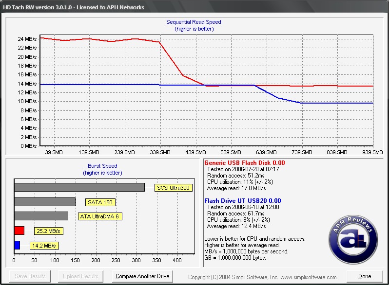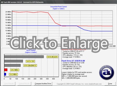 The red line shows OCZ Rally2's read performance while the blue line indicates our OCZ Mini-Kart results. Running at a top speed of over 24 MB/s read speed at certain points, it really slowed down near the end, giving it an average of 17.8 MB/s read speed according to HDTach. This is still a very impressive result, but once again its less than spectacular 51.2ms random access is not very acceptable for a USB thumb drive as we've complained about in our OCZ Mini-Kart review. The Mini-Kart's random access time is 61.7ms.