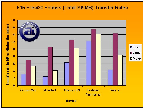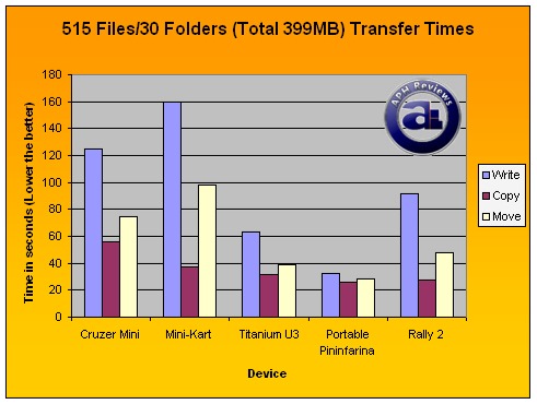 The first series of tests are 515 files of write/copy/move. The total combined file size is 399 MB and contains a variety of different files, as mentioned earlier.