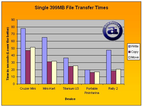 Single file write test. Again, the SanDisk Cruzer Titanium U3 holds the lead with the Rally2 coming in close at second place. This gives us a 10.88 MB/s write performance for the Titanium U3 with the Rally2 trailing behind again at 8.39 MB/s for our single file write benchmark.