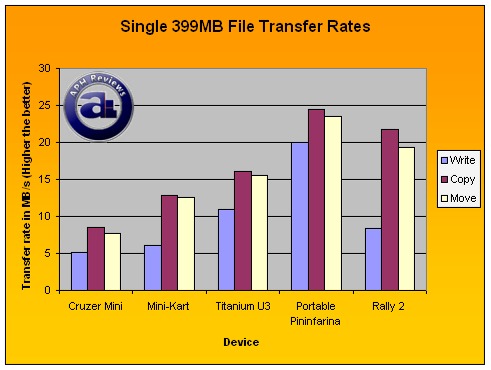 When it comes to our single file read test, the OCZ Rally2 brings back its performance crown in file read performance once more. This means a 16.1 MB/s score for the Titanium U3 with OCZ Rally2's impressive transfer rate in our benchmark with a 21.81 MB/s score.