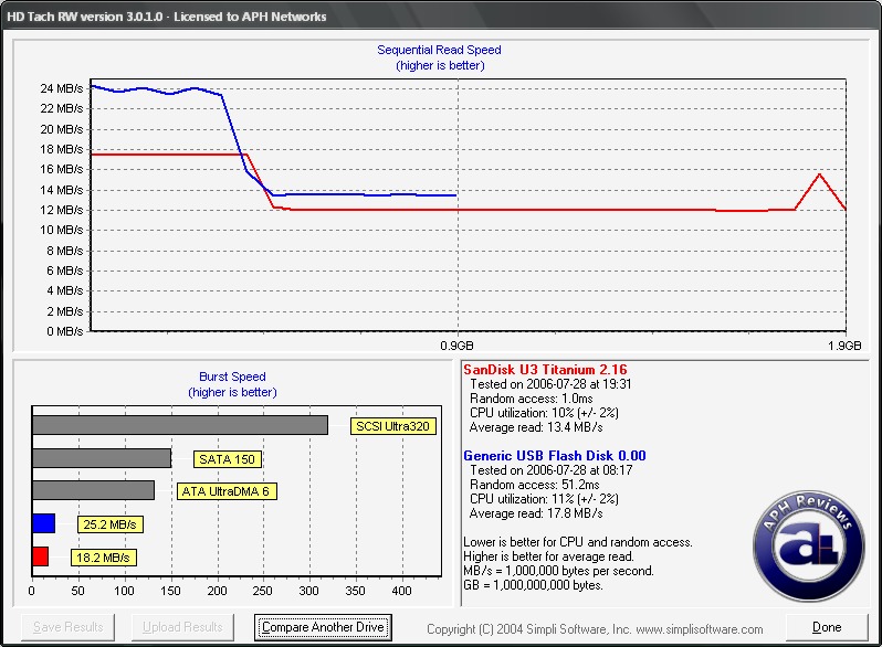 When compared to the SanDisk Cruzer Titanium U3 (Where the red line is the Titanium U3 and the blue line represents OCZ's Rally2), the Rally2 has a clear performance lead but held back by its relatively large drop in the middle. At 17.8 MB/s average read speed, it is definitely better than the Titanium U3's 13.4 MB/s score (Which is still really good). Once again, we must complain OCZ Rally2's 51.2ms random access, since the Titanium U3 has a truly more superior result with 1.0ms random access time hitting our charts.