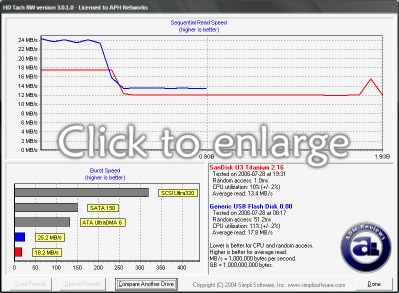 The Rally2 features an orange LED that blinks during disk activity. As you can see in the photo above, the Rally2's width is not much wider than the USB port itself, as opposed to the SanDisk Cruzer Titanium U3. Moving on, our benchmarks were completed on my 1337 pwnz0r computer: