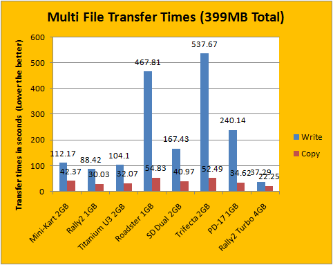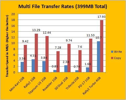 Same goes with our write performance tests. While this performance benchmark is good enough to bring most flash drives down to their knees, again the OCZ Rally 2 Turbo finished it at a record breaking 237.29 seconds -- or 10.7MB/s in multifile write.