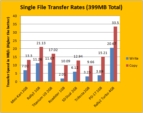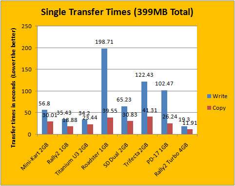 In our APH proprietary single file benchmark, this test set is used to see the maximum real life potential of the flash drive. Finishing the read portion of this benchmark at 11.91 seconds, this 33.5MB/s read performance is simply the fastest we've seen in any flash drive -- it's quite close to OCZ's advertised speed at 35MB/s read speed. Heck, any faster would probably be limitations of USB2.0. The next closest is the original Rally2 at 21.13MB/s, as shown in the graph above. This is absolutely impressive.